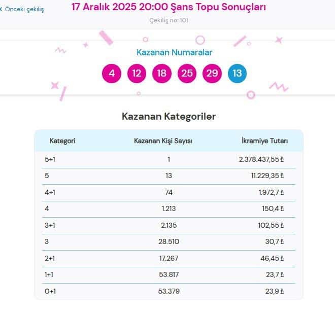 Sisal Şans tarafından düzenlenen Şans Topu canlı çekilişi, 17 Aralık 2025 Pazar günü saat 20.00’de, noter huzurunda gerçekleştirildi. Çekiliş, Milli Piyango Online YouTube hesabı üzerinden de canlı olarak yayınlandı.