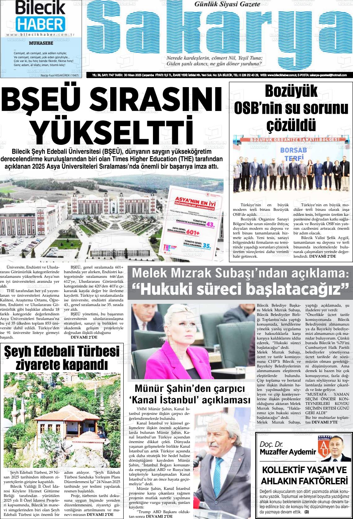 Bİlecİk Yerel Gazeteleri 08 Ekim 2025, Çarşamba Günü Manşeti