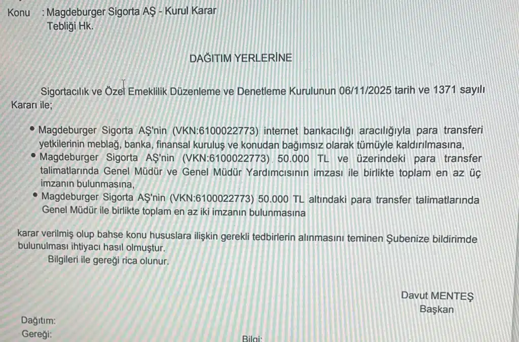 Sigortacılık ve Özel Emeklilik Düzenleme ve Denetleme Kurumu Magdeburger Sigorta ile ilgili özel bir karar yayınladı.